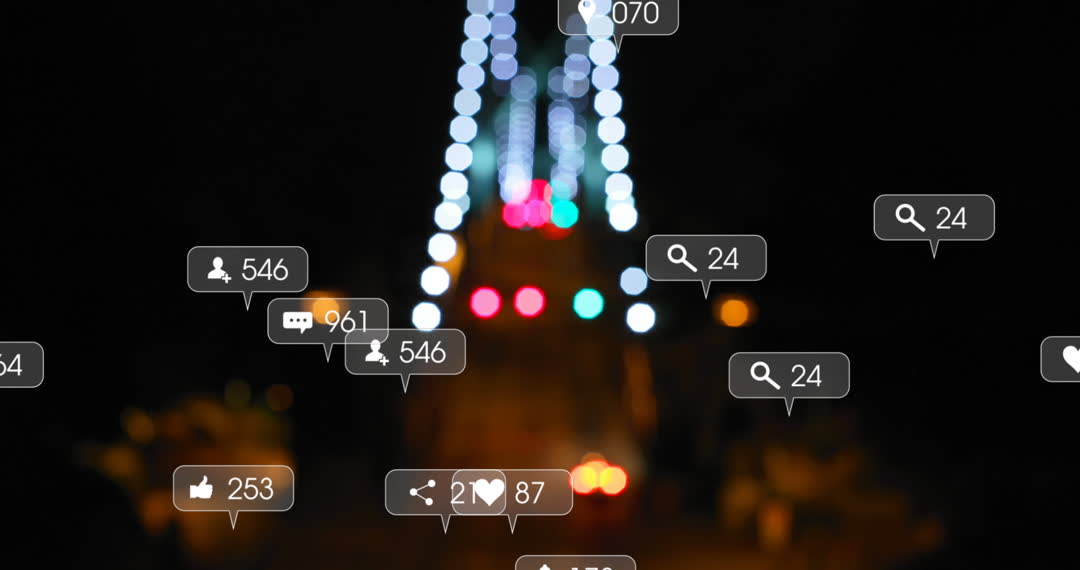 Blurred background featuring various social media interaction icons with numeric indicators. Icons represent likes, comments, and other online engagement metrics, signifying global connectivity and digital communication. This videory can be used for projects focusing on online engagement, technology trends, or promotional material related to social media marketing and digital platforms.