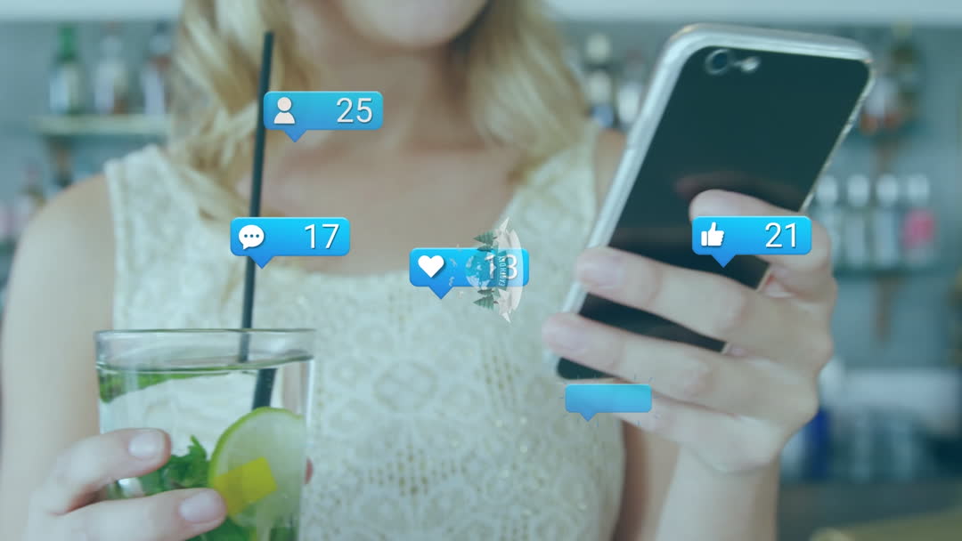 Woman multitasking by using smartphone to browse social media while holding a refreshing lime drink, illustrating modern digital connectivity and lifestyle. Icons for notifications, likes, and messages overlay give sense of online interaction and engagement. Use in articles about social media trends, digital culture, or lifestyle technology integration.