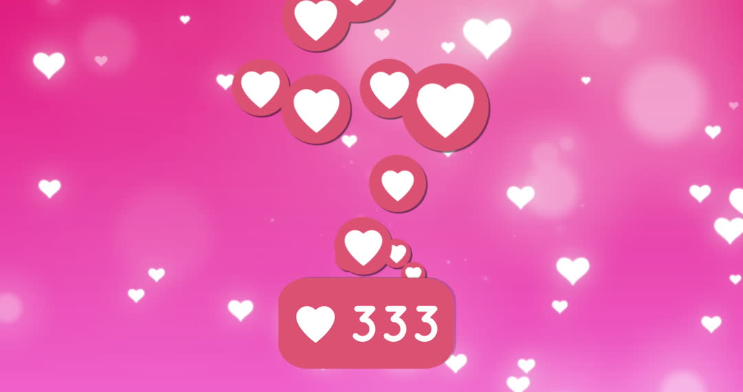 Illustrates the concept of social media engagement with animated heart emojis and likes counts against a vibrant pink backdrop. Ideal for enhancing content related to social network interactions, online popularity, and digital community growth. Useful in presentations, blog posts, and promotional materials exploring the dynamics of user engagement on platforms like Instagram and Facebook.