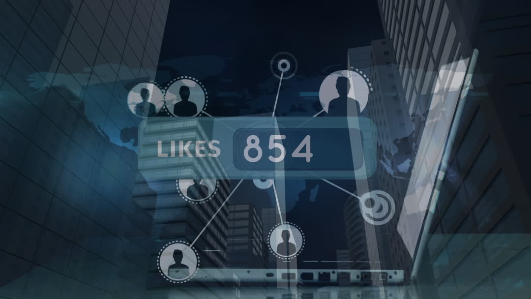 Concept of social media interaction juxtaposed with urban office buildings highlights global connectivity and business networking. Useful for illustrating themes related to technology, digital communication, social engagement metrics, and corporate growth strategies in blogs or articles about modern cities and tech integration.