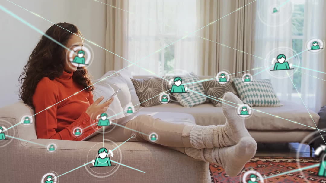 Depicts a woman sitting comfortably on a sofa, engaging with connections on a smartphone. Visualized by interconnected icons overlaid on the scene, suggesting a focus on digital networking and social media interaction. Ideal for illustrating concepts of remote communication, networking technologies, digital lifestyle, or mobile app advertising.