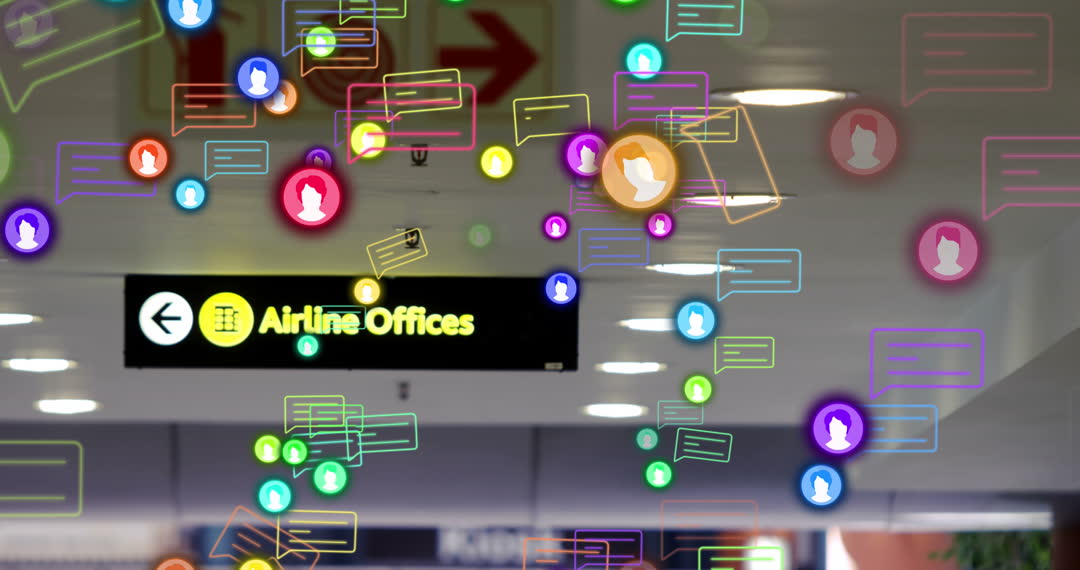 This visual symbolizes the integration of online social interactions and communication technology in a busy airport setting, represented through animated colorful neon icons hovering around an airline office signboard. Ideal for illustrating articles or presentations on digital connectivity, social media influence in public spaces, and modern communication trends within travel and aviation industries.