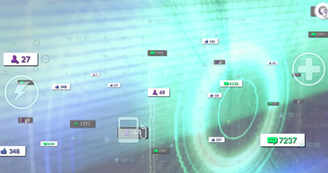 Animation showcases the fusion of social media notifications and stock market data, representing digital communication and investment trends. Useful for illustrating the intersection of technology and finance in contexts like multimedia presentations, telecommunications advertising, or technology blog covers.