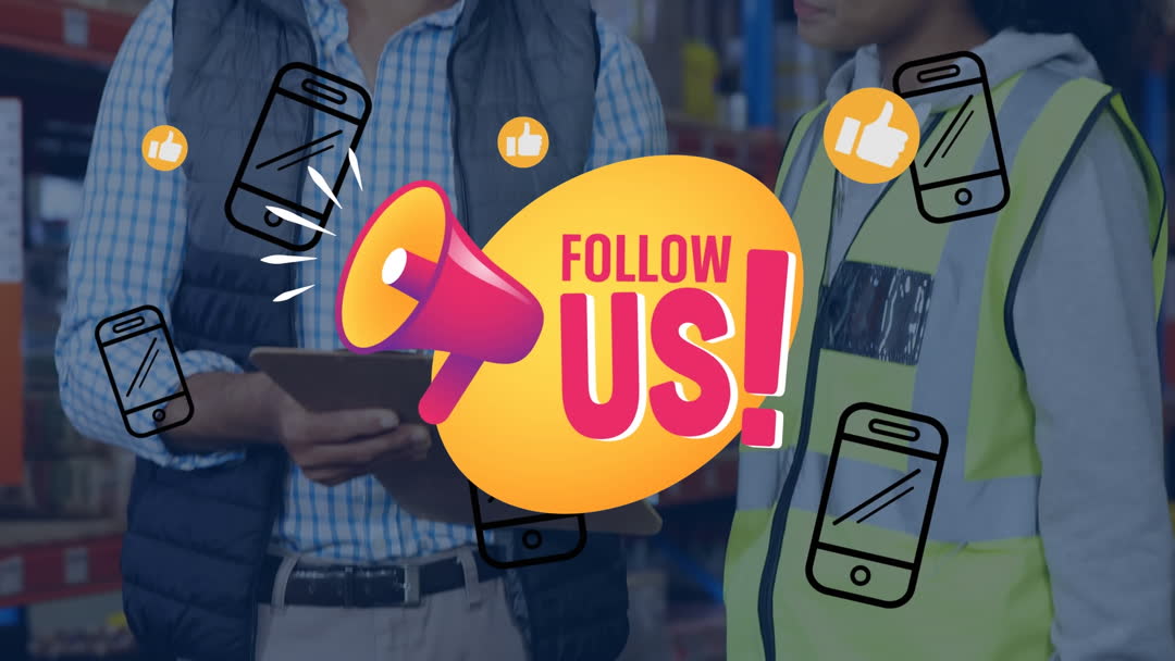 Digital illustration featuring male supervisor and female worker discussing in a warehouse. Overlaid with animated graphics promoting social media followership and engagement, emphasizing the intersection of social media networks with logistics. Useful for content on digital marketing strategies in logistics, social media boosts for brands, or case studies in business technology. Ideal for blogs, presentations, and business discussions focused on fostering online growth within industrial or warehouse environments.