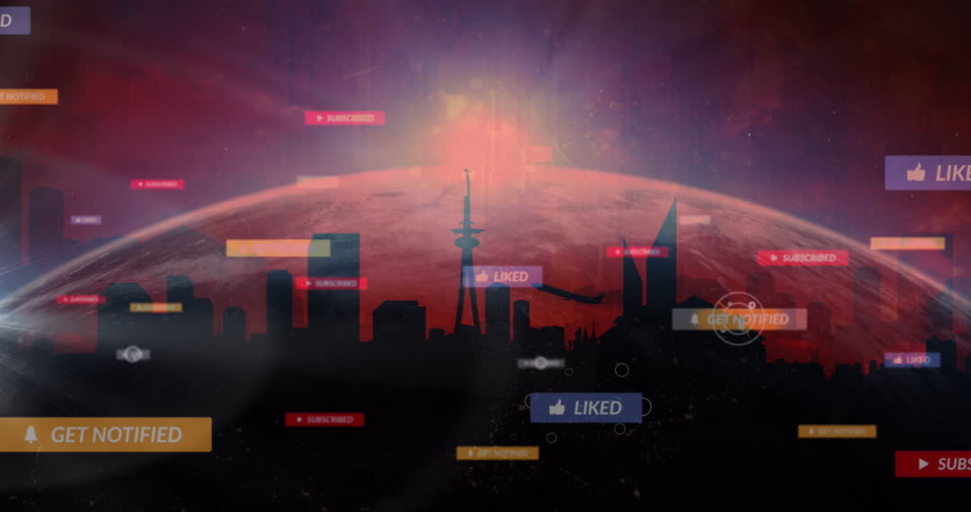 Animated city skyline beneath layered digital icons representing social media interactions like likes and subscriptions. Planetary background signifies global outreach of social platforms, suitable for illustrating articles on technology evolution and internet culture, marketing strategies or concept videos on communication advancements.