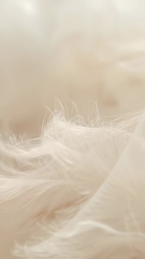 AI Generated Video. Showing close-up vertical macro footage of soft beige down feathers rippling under shifting warm light. Creating shallow depth of field with dreamy blur and fine filament detail in foreground. Leaving generous negative space at top for copy and logo. Using warm neutral palette to convey cozy, luxury mood. Offering subtle slow motion loop suitable for calming backgrounds. Working well for beauty and wellness advertising, bedding and home textile campaigns, sleep app intros, spa branding, product packaging texture, web hero panels, social media reels and stories, and stock video libraries. Recommending crop for vertical mobile formats, applying gentle color grade to match brand palette, looping seamlessly for background use, and placing bold clean typography in negative space for headline messaging.