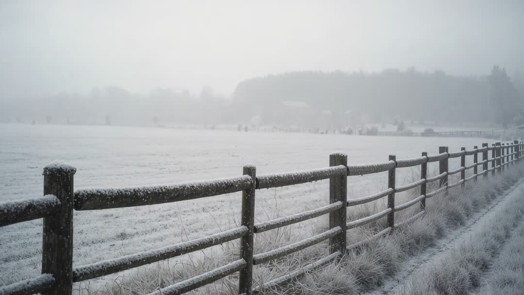 - Soft Snow Falling Over Frosted Wooden Post-and-Rail Fence Along Rural Pasture at Dawn