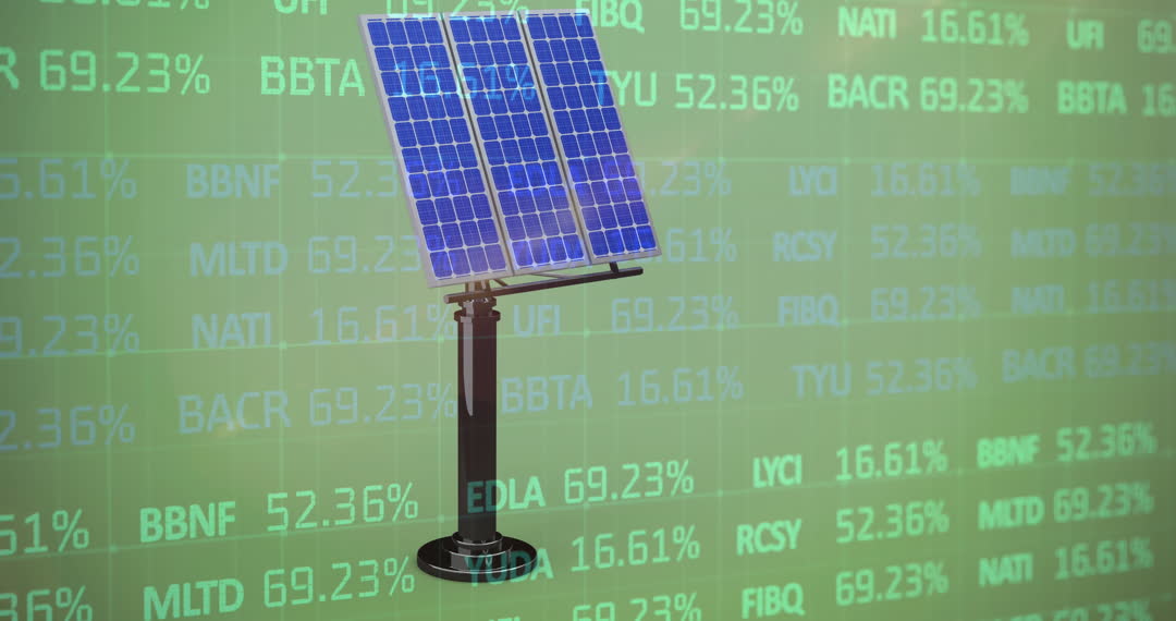 Digitally-generated video depicting a solar panel in front of a background filled with financial data and percentages. Green energy concepts blend with digital technology, emphasizing clean energy's role in modern analytics and finance. Useful for articles on renewable energy investments, tech-savvy energy solutions, and financial impacts of clean technology.