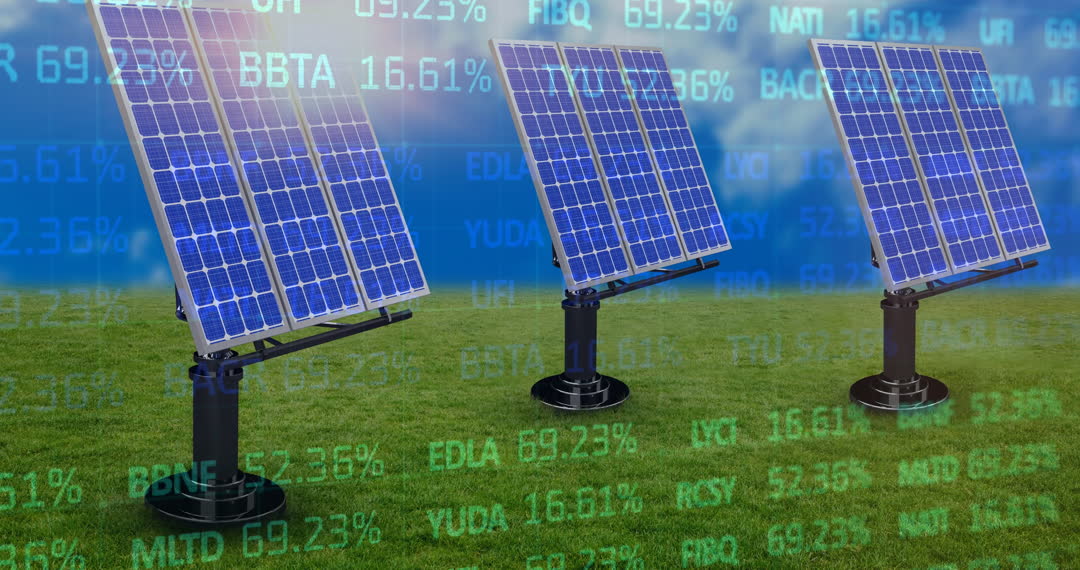 Solar panels standing in grassy field with financial statistics overlaying in the foreground. Useful for illustrating the intersection between finance and renewable energy solutions, suitable for digital advertising and presentations focused on sustainable investments and technology advancements.