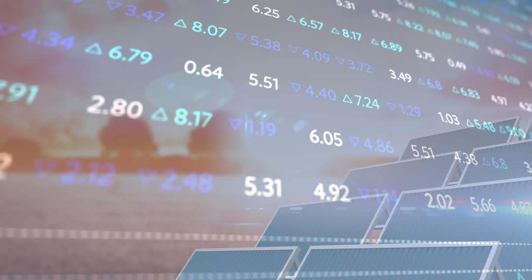 Digitally produced visual depicts interplay between solar energy technology and financial data representation, symbolizing investment in renewable resources. Visual can be ideal for use in presentations, articles, or reports focused on eco-friendly investment opportunities, green technology advances, or economic growth in renewable sectors.