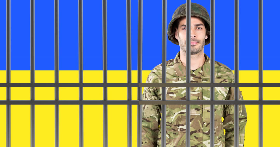 The visual conveys themes of imprisonment and military involvement against the backdrop of the Ukraine crisis. Useful for discussions or media about military engagement, peace talks, conflict resolution, or Ukraine's geopolitical issues.