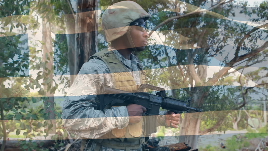 Soldier Holding Rifle with Greece Flag Overlay in Background Video