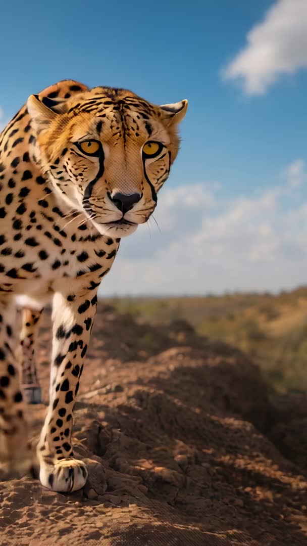 AI Generated Video. Showing solitary cheetah walking along rocky savanna ridge and approaching camera, intense golden eyes and tear-mark facial stripes drawing focus. Low-angle composition highlighting lean body, powerful limbs, and paw placement on rocky outcrop; shallow depth of field isolating subject against blue sky and distant grassland. Warm daylight enhancing coat contrast and spot pattern. Featuring vertical video framing ideal for mobile and social platforms. Suited for wildlife documentary sequences, safari travel promos, conservation and fundraising campaigns, educational clips on big cat behavior, commercial spots for outdoor brands, and cinematic nature montages. Suggesting slow-motion for stalking moments, ambient savanna soundscape for atmosphere, cutaways to landscape for context, and color grading for cinematic mood. Delivering high-impact close-up footage for headlines, hero shots, and title sequences.