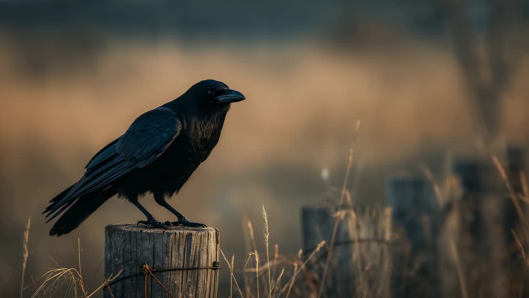 AI Generated Image. A lone crow rests on a wooden fence post amidst a muted landscape of tall, dry grasses. The scene offers a minimalist portrayal of solitude and the quiet beauty of nature. The video captures the essence of wilderness, making it ideal for projects related to wildlife, rustic settings, or themes of solitude and natural beauty.