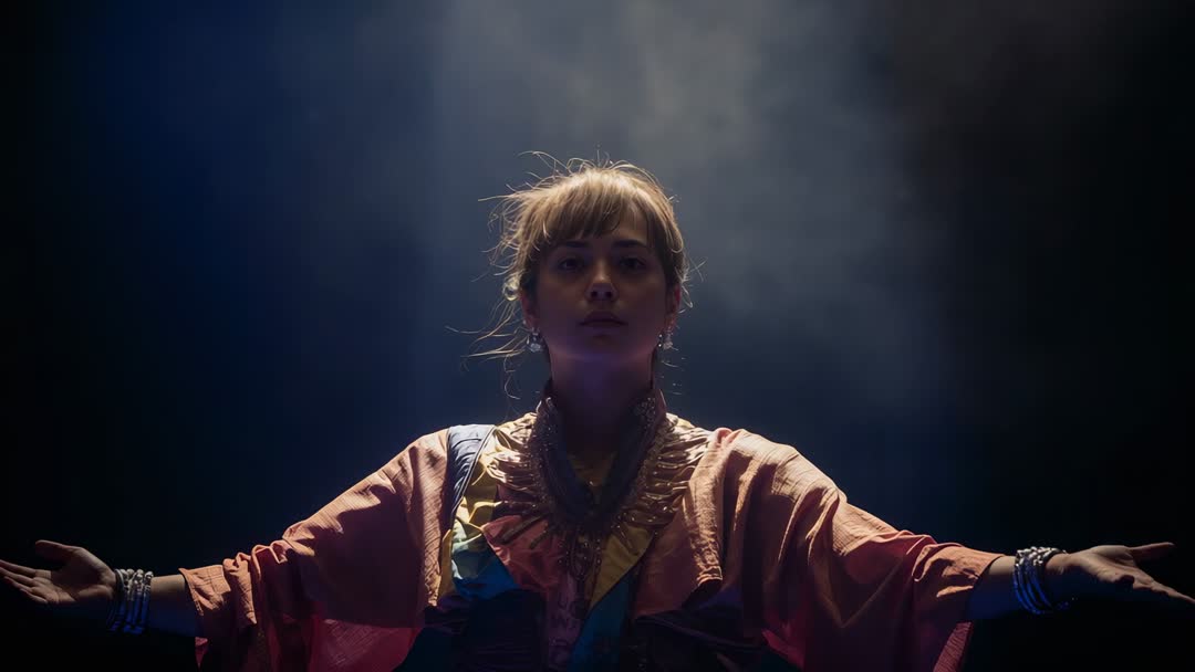 AI Generated Image. Showing solo performer standing with arms outstretched under descending spotlight, closing eyes and projecting calm intensity. Wearing flowing robe and layered necklaces, performer projecting ritual and contemplative mood while stage haze and backlight creating cinematic low key silhouette and deep blue atmosphere. Suiting theatrical trailers, music video intros, meditation app backgrounds, dramatic ad campaigns, festival promos, social media clips, video essays, contemplative scene transitions. Edit suggestions: adding slow motion, subtle lens flare, gentle color grade toward teal and indigo, looping 10-30 second clip for background use, tight crop for emotional close-up, wide frame for immersive stage atmosphere. Perfect for hero footage, mood-led branding, or contemplative storytelling sequences.