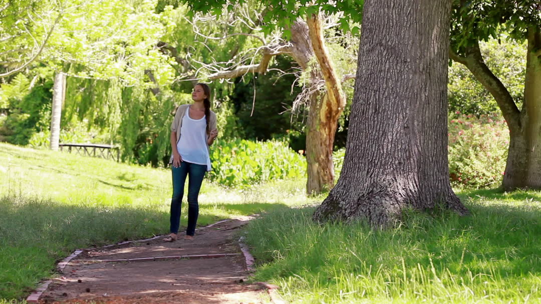 Woman enjoying a peaceful walk along a shaded pathway in a verdant park. Surrounded by trees and greenery, this scene captures tranquility and a connection with nature. Ideal for projects related to outdoor activities, wellness, and relaxation.