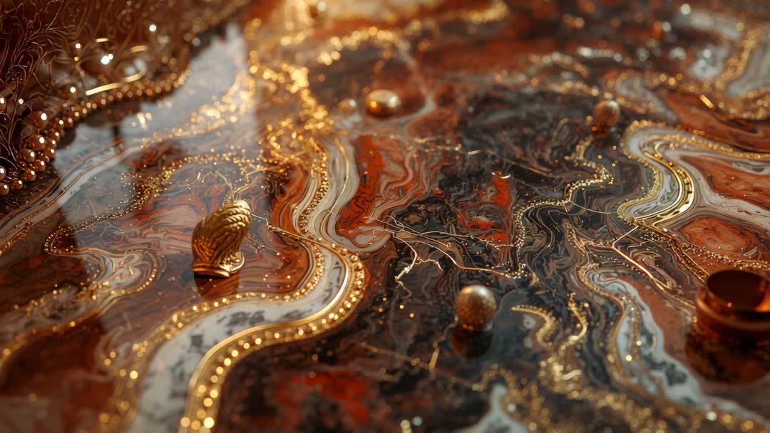 AI Generated Image. Dynamic video featuring an elegant, sophisticated mix of fluid art with golden and ebony hues accentuated by intricate waves on a textured surface. Metallic tones blend seamlessly, showcasing art elements like a vessel fragment and sphere that add perception of depth. Ideal for exploring modern decor themes, luxurious design concepts, artistic interpretations, and can be employed in showcasing sophisticated decor applications by designers or creatives wanting to accentuate modern aesthetics.