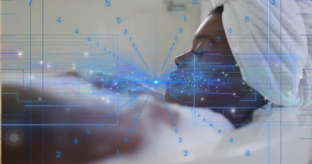 - Spa client receiving futuristic skin analysis with holographic data overlay for wellness