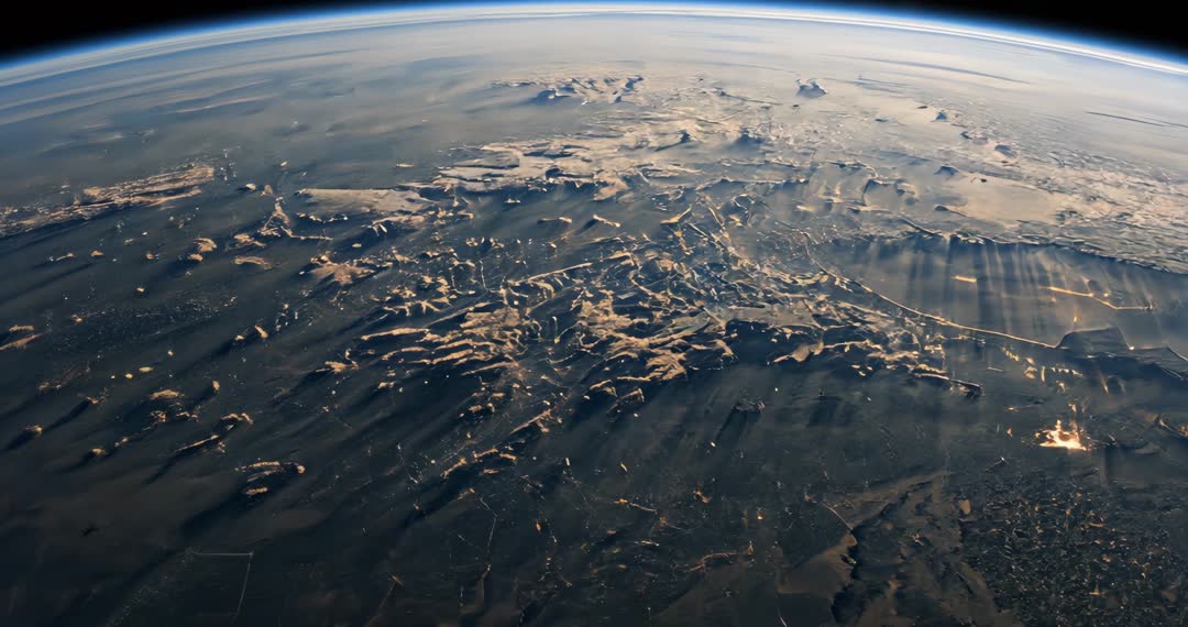 AI Generated Image. This stunning scene features Earth's horizon from a tilting spaceship camera, showcasing intricate cloud shadows and radiant sunburst rays dimpling the planet's surface. Useful for conveying themes of space exploration, Earth's beauty, and the technology involved in astro-photography. Ideal for platforms discussing outer space, astrophysics applications, or academic presentations on Earth's atmosphere and environmental sciences.
