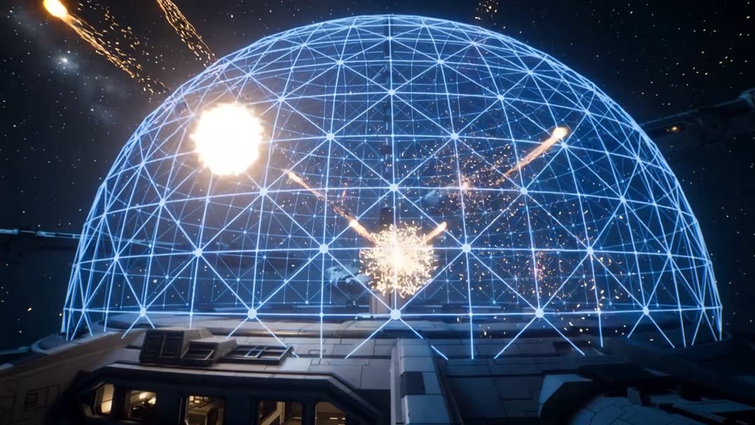 Spaceship Shield Absorbing Incoming Fire with Blue Geodesic Energy Dome in Space Battle Video