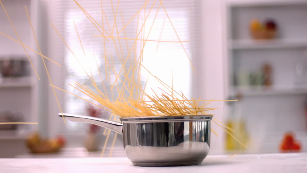 - Spaghetti Noodles Falling Into a Pot in Modern Kitchen