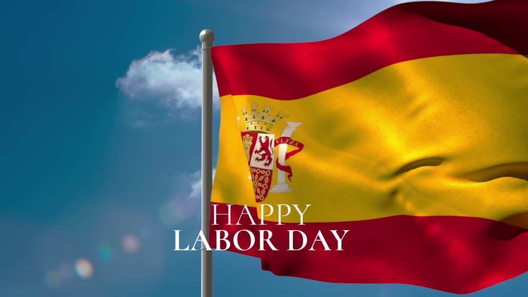 - Spain Flag Waving with Happy Labor Day Text Under Clear Blue Sky