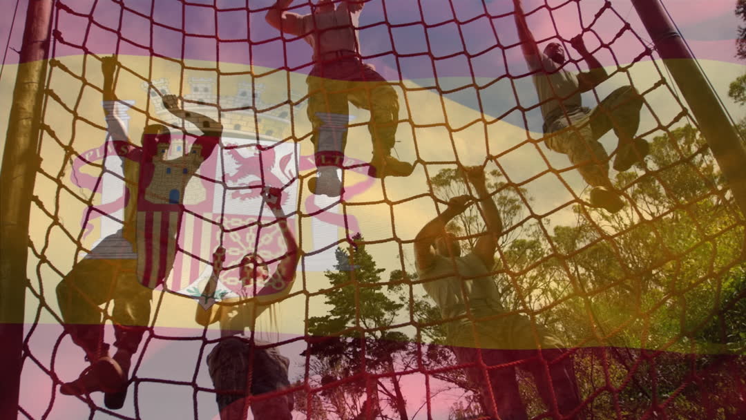 Diverse group of soldiers participating in climbing net exercise. Spanish flag overlay symbolizes patriotism and unity. Useful for content on military training, national defense, or motivational pieces on teamwork and resilience.