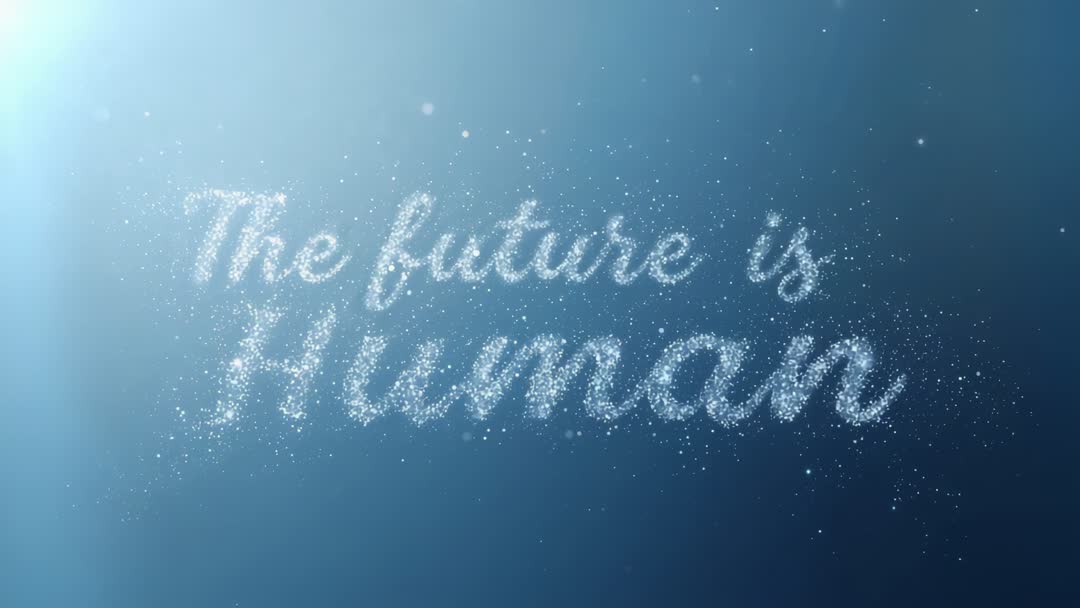AI Generated Image. Featuring sparkling particles clustering into cursive message 'future is Human' on deep blue gradient with soft light rays and subtle bokeh. Showing slow, elegant motion ideal for title reveal, brand intro, keynote opener, product launch, social media promo. Suiting technology and innovation narratives focused on human-centered design, AI ethics, leadership, and inspirational messaging. Recommending looping short clip for hero backgrounds, overlaying logo or tagline, using color grading to match brand palette, and adding subtle audio for cinematic impact.