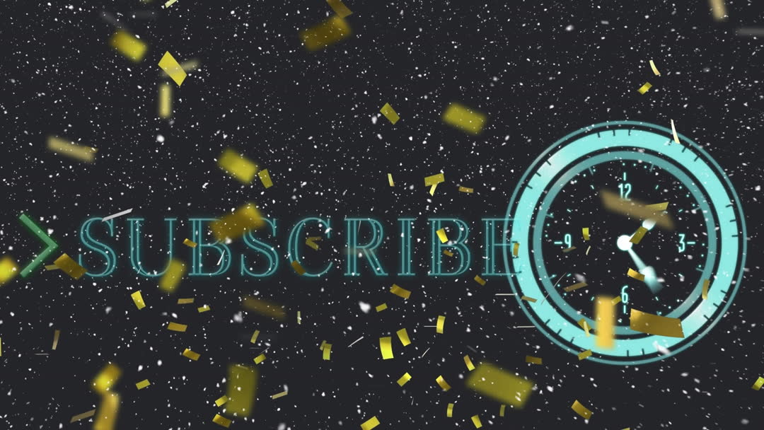 This digital animation features 'subscribe' text alongside a clock, adorned with gold confetti and falling snow, creating a festive Christmas atmosphere. Ideal for use in digital marketing materials, video intro animations, or as a festive call to action in subscription-based services, focusing on winter promotions and holiday-themed content.