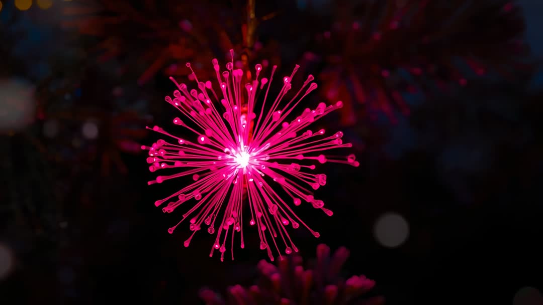 AI Generated Image. A vibrant pink spherical fiber optic lamp pulsates softly among evergreen branches. Radiating a futuristic and elegant aura, the lamp adds a modern decor touch suitable for events, special occasions, or innovative interior spaces. Use this visual to inspire design ideas or feature lighting options that enhance atmospheric craftsmanship.