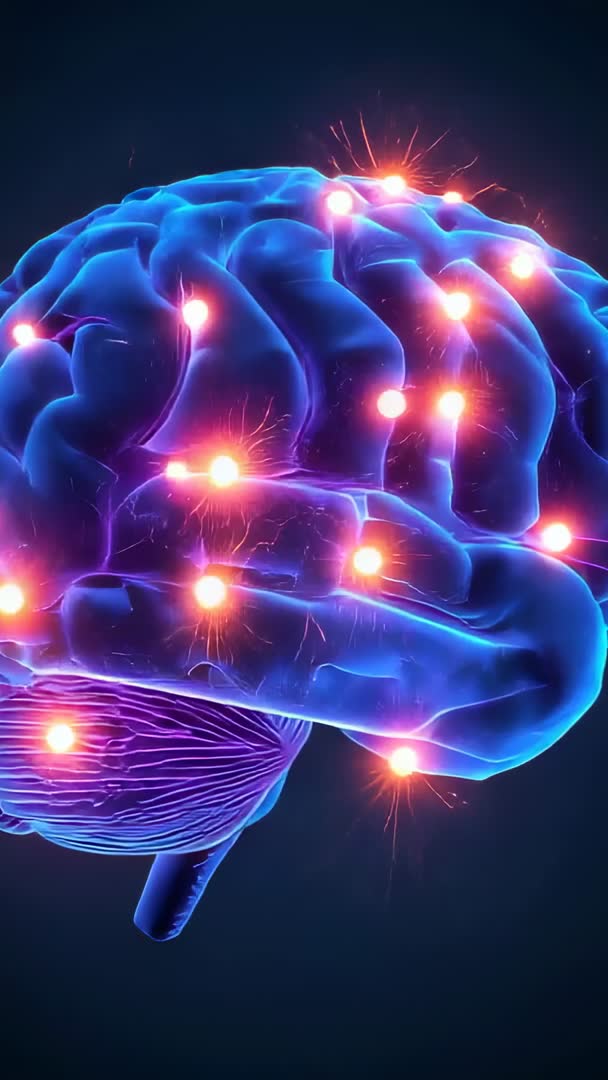 AI Generated Image. Looping vertical 9:16 video showing spinning 3D brain with neon blue cortex, flaring orange neural nodes, pulsing electric sparks and subtle synaptic trails. Visualizing neural activity and synaptic firing with cinematic lighting and smooth rotation for high-impact visual storytelling. Ideal for neuroscience presentations, medical education, AI and technology promotions, biotech company intros, conference backdrops, mobile app splash screens, social media stories and vertical ads. Use as header animation for e-learning modules, background for explainer videos, overlay behind text and lower thirds to emphasize data or headlines. Color palette combining deep navy, neon blue and warm orange creating strong contrast for typography and overlays. Ready for looping playback and cropping for multiple vertical platforms; suitable for editorial, corporate and commercial projects.