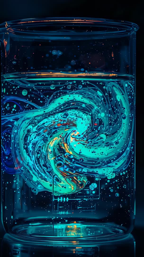 - Spinning beaker forming neon teal vortex over lit bench, glowing bubbles in vertical lab footage