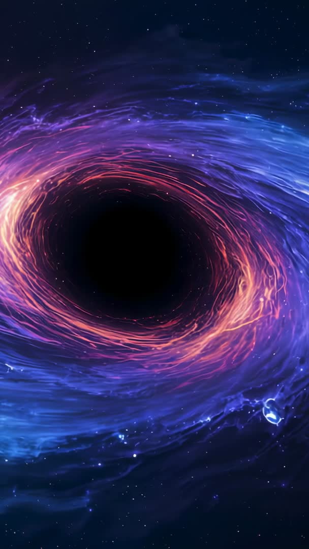 AI Generated Image. Vertical cinematic clip featuring spinning black hole with glowing accretion disk pulling stellar debris inward. Vivid color palette shifting from deep blue to fiery orange highlighting plasma flows and spiral motion around dark core. Suitable for science content, documentary openers, sci-fi trailers, game intros, app splash screens, wallpaper animation, social media reels, presentation backdrops. Pairing with ambient electronic soundtrack or narrator voiceover explaining gravity, accretion processes, relativistic effects. Supporting loopable playback and high-resolution vertical format for mobile-first campaigns and short-form video platforms. Recommended for use as background visual, motion graphic element, title opener, or educational illustration of black hole dynamics.
