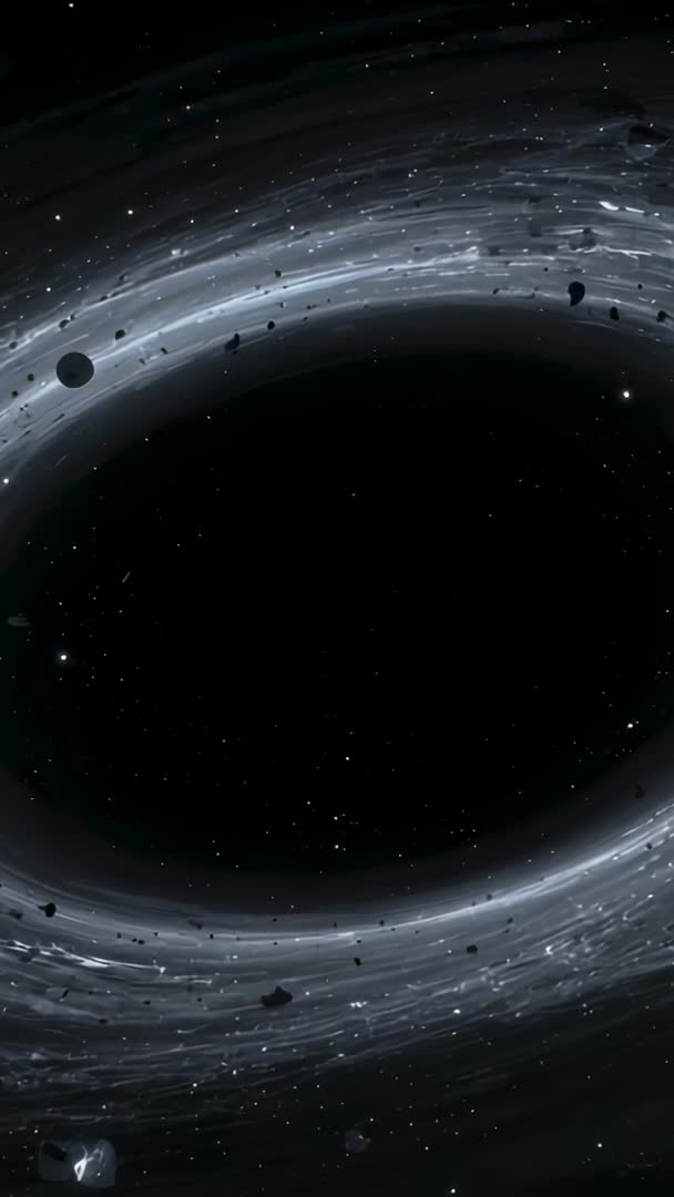 AI Generated Image. Vertical sci-fi clip showing spinning black hole lensing surrounding light and shearing accretion disk while scattering rocky debris into orbit. Composition presenting dark central singularity framed by luminous torus and streaming particles, creating sense of immense gravity and motion. Visual style combining high contrast, subtle star field, cool monochrome palette, and cinematic motion blur for dramatic depth. Optimized for vertical 9:16 aspect ratio and mobile consumption. Use for sci-fi film openers, space documentary segments, astronomy explainers, mobile app backgrounds, social video ads, title intros, planetarium visuals, or VFX plates. Clip working well as loopable background for vertical screens and short-form content, delivering immersive cosmic atmosphere for educational and entertainment projects.