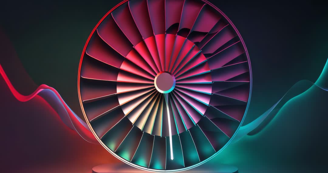 AI Generated Image. A circular fan component seamlessly spinning with transitions of vibrant colors. Accompanied by wave-like ribbons that dynamically enhance movement. Ideal for topics on technology, innovation, motion dynamics, or futuristic concepts. It can illustrate energy-related themes, serve as a backdrop in a presentation, or find use in creative visual projects focused on modern technology.