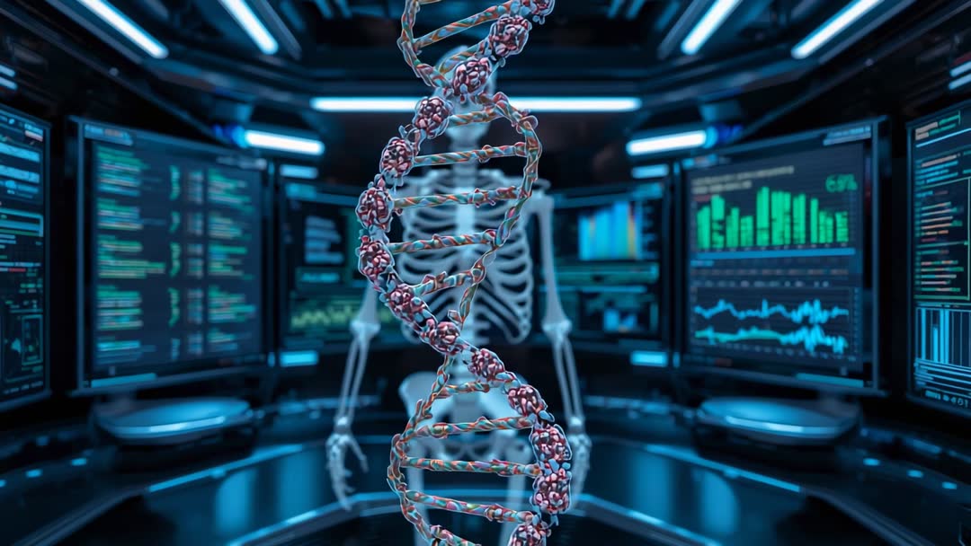 AI Generated Image. This video depicts a spinning DNA helix inside a high-tech laboratory setting, complete with digital monitors displaying various data, and a skeleton model in the background. It's perfect for illustrating concepts in biotechnology, genetic research, and the intersection of science and technology. Ideal for educational materials, scientific presentations, and media articles about advancements in molecular biology.