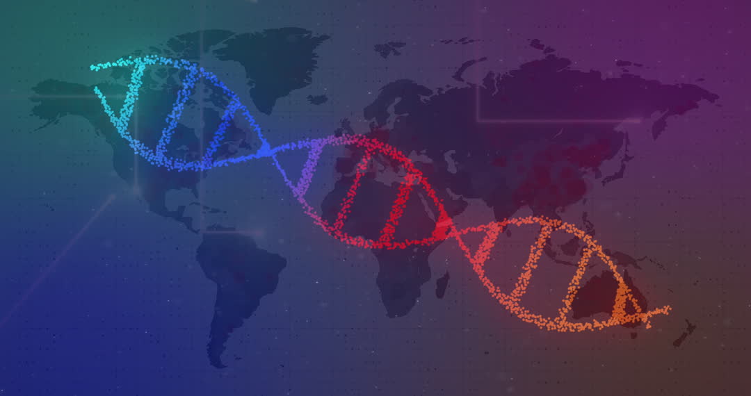 Dynamic animation depicting a glowing DNA strand overlaying a map background, symbolizing global research and biotechnology. Perfect for use in educational materials, science presentations, or environments where showcasing technological advancements in genetics and healthcare is essential.