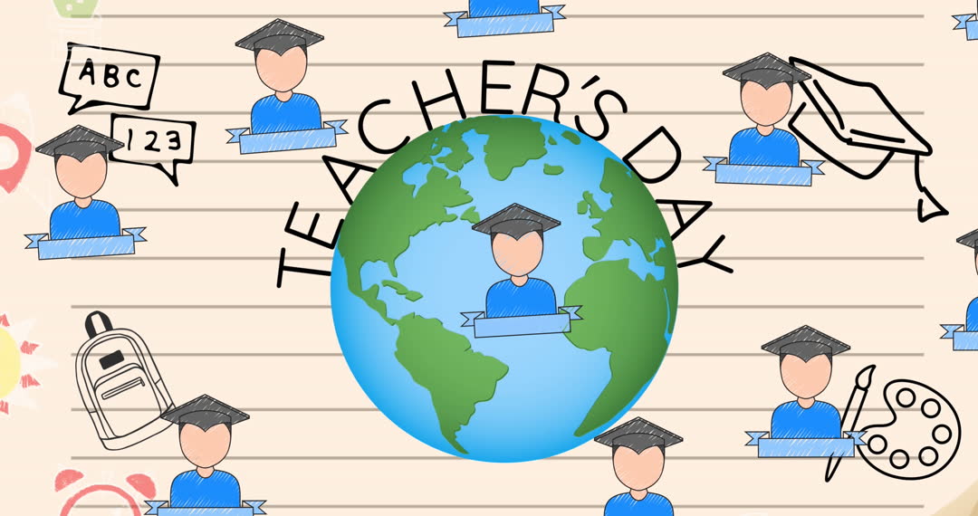 Illustration showcases globe with cartoon graduates wearing caps, representing educational achievements globally in celebration of Teacher's Day. Suitable for event invitations, online educational platforms, and teacher appreciation materials. Perfect for promoting educational events, recognition ceremonies, and teaching resources via digital and print media engagements.