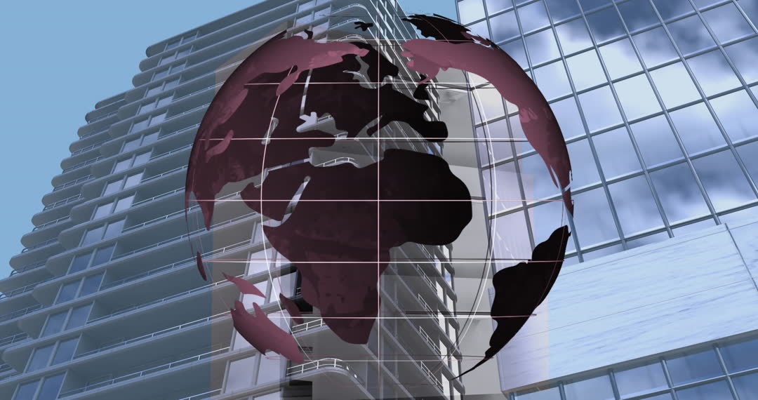 Globe graphic spinning prominently over reflective modern buildings, representing themes of global business reach and advanced data analytics technology. Ideal for illustrating urban business innovation or visual interest for articles, presentations, and reports on topics like technology, globalization, or future-of-work trends.