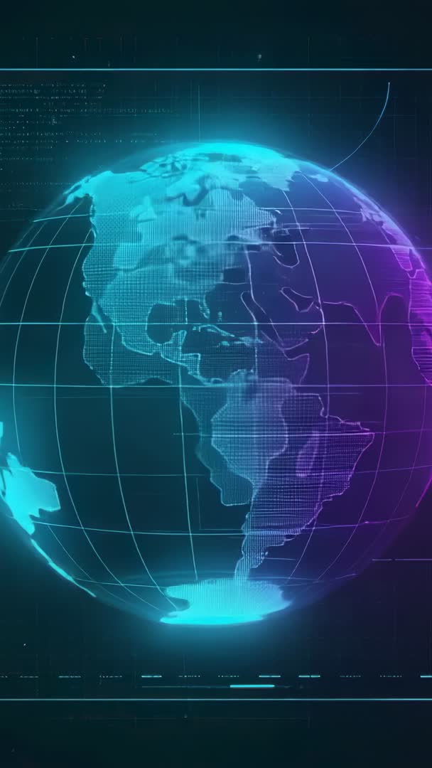 AI Generated Image. Showcasing spinning globe rotating eastward with neon cyan and purple gridlines, dot-matrix landmass overlay, and subtle ticker animation along bottom. Serving vertical social media stories, powering app intros, enhancing tech startup promos, supporting cybersecurity presentations, and visualizing global logistics or market data. Providing loop-ready motion graphic, adaptable color grading, and space for overlaying logo, headline text, and data readouts. Tailoring to vertical 9:16 format and high-resolution export for mobile-first campaigns. Allowing easy speed ramp, loop, and lower-third graphics integration.