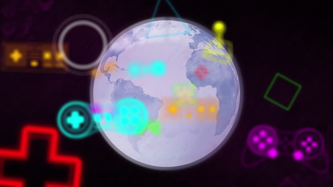 - Spinning Globe Surrounded by Gaming Icons on Black Background