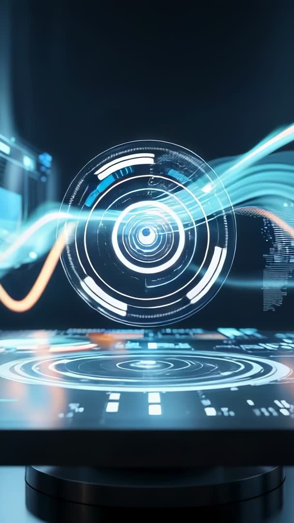 AI Generated Image. Showcasing spinning holographic interface with pulsing concentric data rings and flowing light ribbon above digital control base. Presenting sleek futuristic UI motion design for tech promos, product demos, app intros, AR presentations, cybersecurity campaigns, data analytics explainers, startup pitch decks, and social media reels. Supporting looping playback for seamless background usage and slow-motion extraction for dramatic effect. Allowing easy overlay of text, logos, and UI elements for branding and messaging. Delivering vertical orientation optimized for mobile platforms, stories, reels, and in-app tutorials. Conveying high-tech, immersive, dynamic mood suitable for corporate technology sites, sci-fi trailers, event visuals, and broadcast graphics.