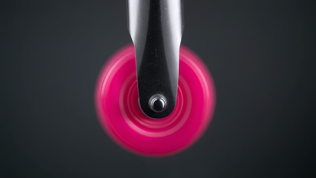 - Spinning magenta caster wheel revealing axle head while fork tilts left
