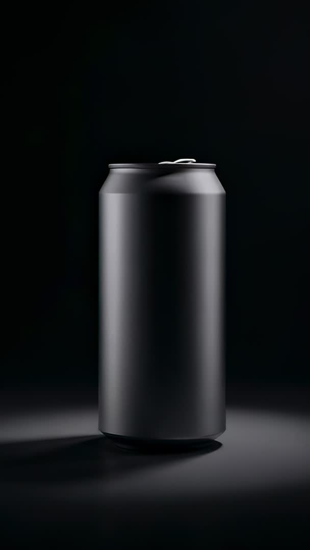 AI Generated Video. Showing spinning matte black aluminum can slowly rotating on turntable, pull-tab revealing at top while subtle reflections accent curved surface. Lighting maintaining low-key, moody aesthetic to emphasize matte finish and metallic details. Camera framing vertical 9:16 for social-first presentation with smooth slow spin ideal for looping and label reveal work. Use for beverage branding promos, packaging mockups, product launch reels, luxury drink campaigns, website hero banners, in-store display loops, and social media ads. Easily overlay logo, custom label, or text with high contrast areas for clear typography. Deliverable ready for color grading, motion graphics, and product compositing.