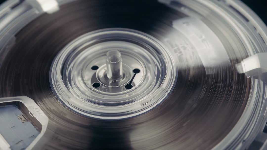 - Spinning Transparent Reel Hub and Dark Magnetic Tape in Cassette Cartridge Macro Clip