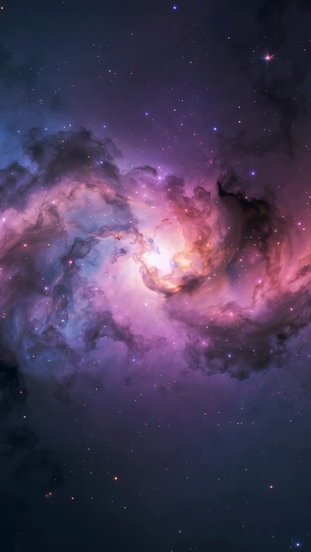 AI Generated Video. Showing spiral nebula rotating while camera is zooming inward toward luminous core, revealing drifting gas filaments, glowing clouds, and sparkling starfield. Offering vivid purple and pink palette with deep space contrast, creating cinematic and mysterious mood. Working well for sci-fi trailers, streaming intros, app splash screens, vertical wallpapers, social media reels, meditation backgrounds, and planetarium snippets. Delivering vertical composition optimized for smartphone displays and portrait video platforms. Providing loop-friendly motion for ambient background use, VJ sets, streaming overlays, educational astronomy clips, and web hero banners. Including ready-to-use clip for commercial projects, editorial science features, classroom presentations, and promotional campaigns.