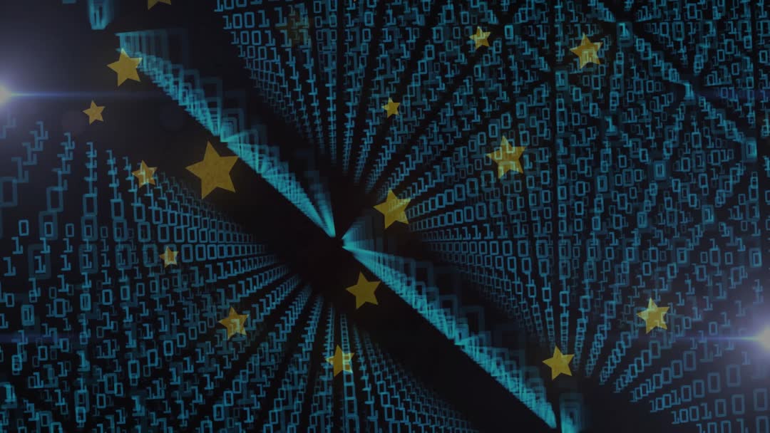 Animation illustrates interaction between digital data and a cosmic setting with binary numbers spiraling towards the center while stars drift across, suggesting data flow and interconnection of technology with cosmic elements. Ideal for presentations on digital transformation, technological advances, futuristic themes or digital art. Can be used in multiple contexts, including background visuals for tech conferences or educational content on technology and coding.