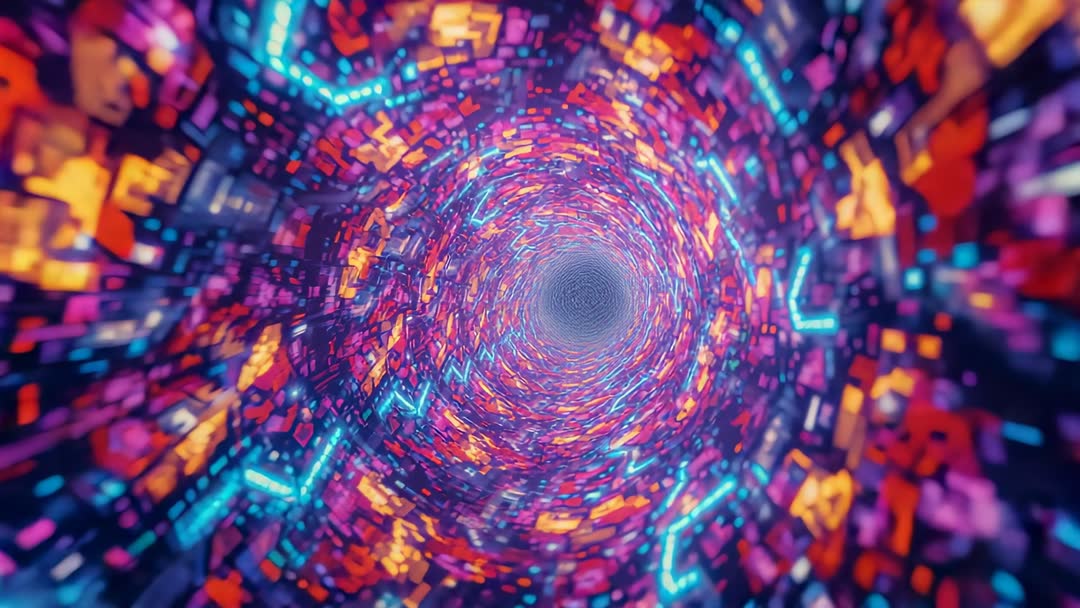 - Spiraling Neon Data Tunnel Racing Through Kaleidoscopic Cyber Vortex Featuring Pulsing Zigzag