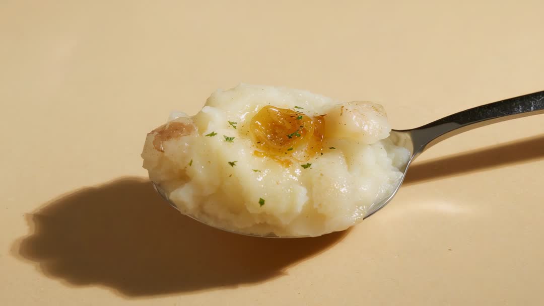 AI Generated Image. Video showing spoon lifting creamy mashed potatoes topped with melting butter and chopped parsley against warm beige background. Studio lighting creating soft shadow and highlighting smooth, fluffy texture and glossy butter pool. Frame focusing on spoon angle and surface detail, conveying comforting, indulgent bite and refined presentation. Serving as looping clip for recipe reels, menu headers, restaurant promos, and social media ads. Helping food bloggers, chefs, and brands in promoting side dishes, ready meals, and comfort-food campaigns. Working well for banners, packaging mockups, cooking tutorials, and editorial food stories. Featuring warm tones, shallow depth of field, and clean composition for easy text overlay and branding.