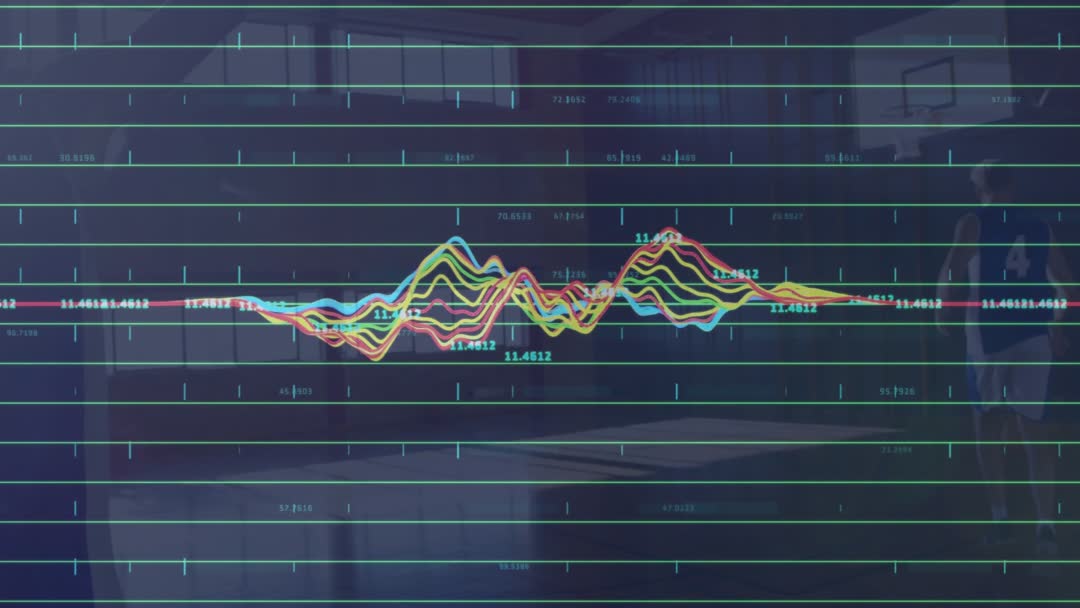 Colorful data visualization lines overlay action on a basketball court, highlighting increasing importance of analytics in sports. Energetic scene manifests dedication and commitment athletes display during intensely competitive moments. Useful for illustrating themes of modern technology integration in sports, teamwork coordination, and advanced athletic performance measurement.